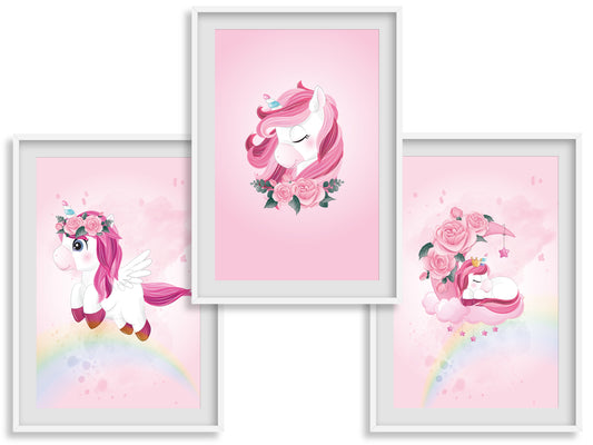 Pink unicorn posters for child/baby room - 3 Posters for girl decoration - Birth gift - A4/A3 format painting - decorative accessory - bb