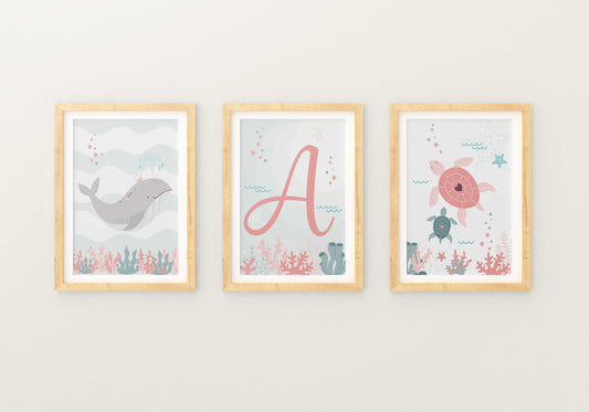 Turtle whale and ocean first name letter - baby children's room - 3 personalized posters Decoration - birth birthday gift idea