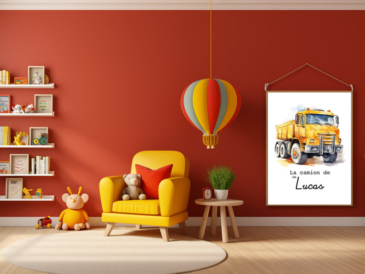 Affiche Personnalisée camion jaune de chantier - Le camion de {Prénom de l'Enfant} pour les petits fans de chantier et travaux