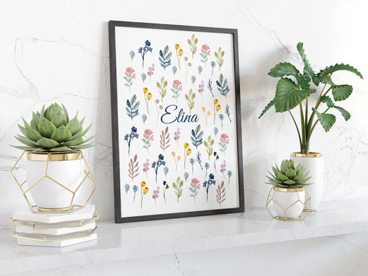 Flowery customizable first name poster - birthday birth - nickname name - child baby girl - wall poster decoration - living room bedroom