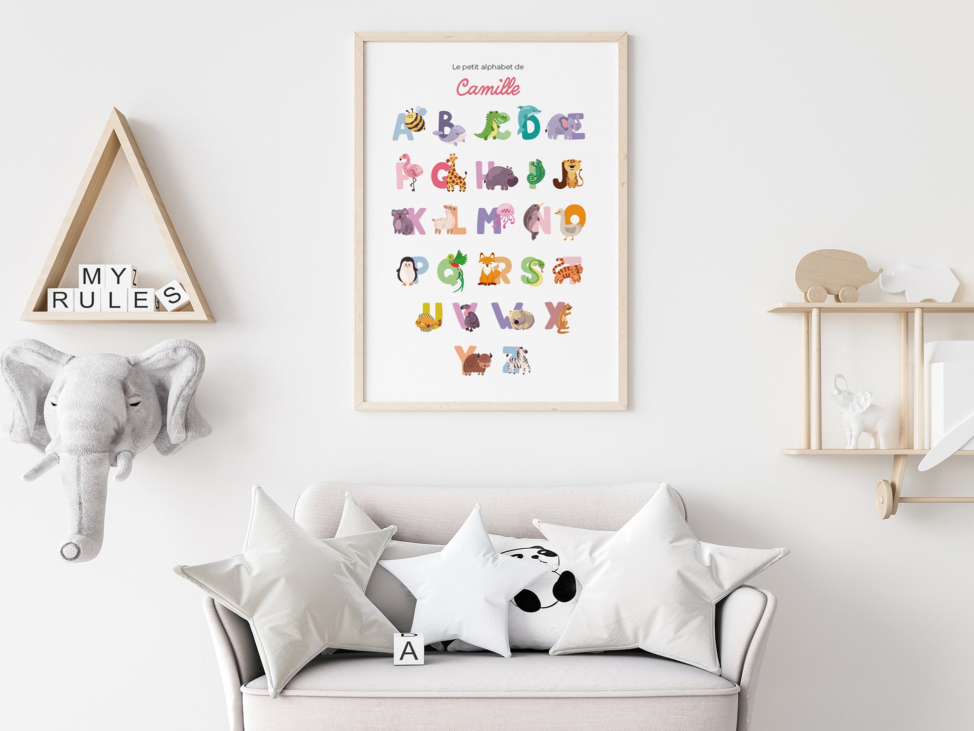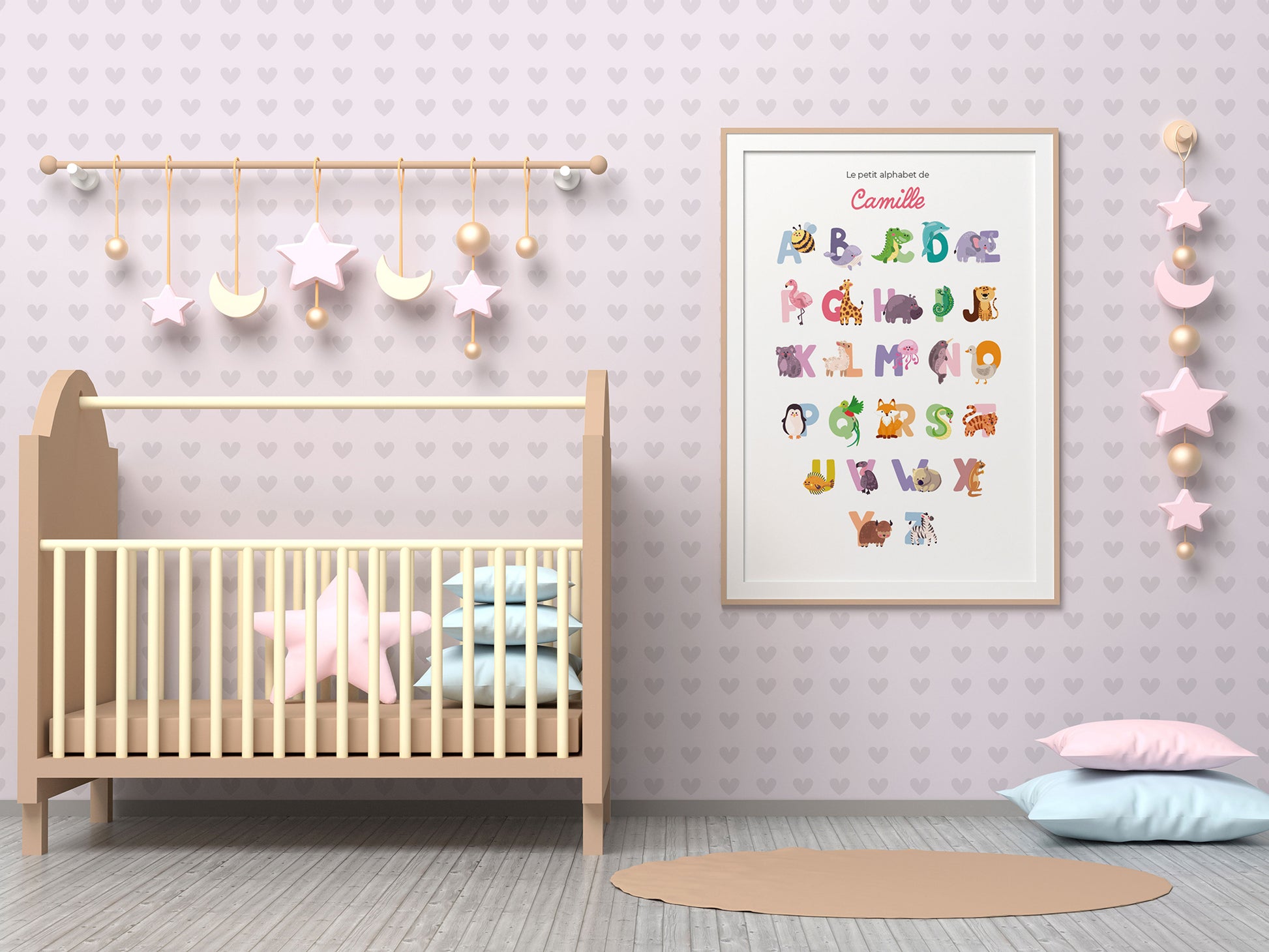 A very popular idea for mothers for a birth, a baby shower, a birthday or a baptism. The decoration of the room is often an important subject and the theme chosen evolves according to age. The theme of animals in bright colors is very beautiful. Imagine posters are worked with finesse to gently awaken and decorate in a modern style.