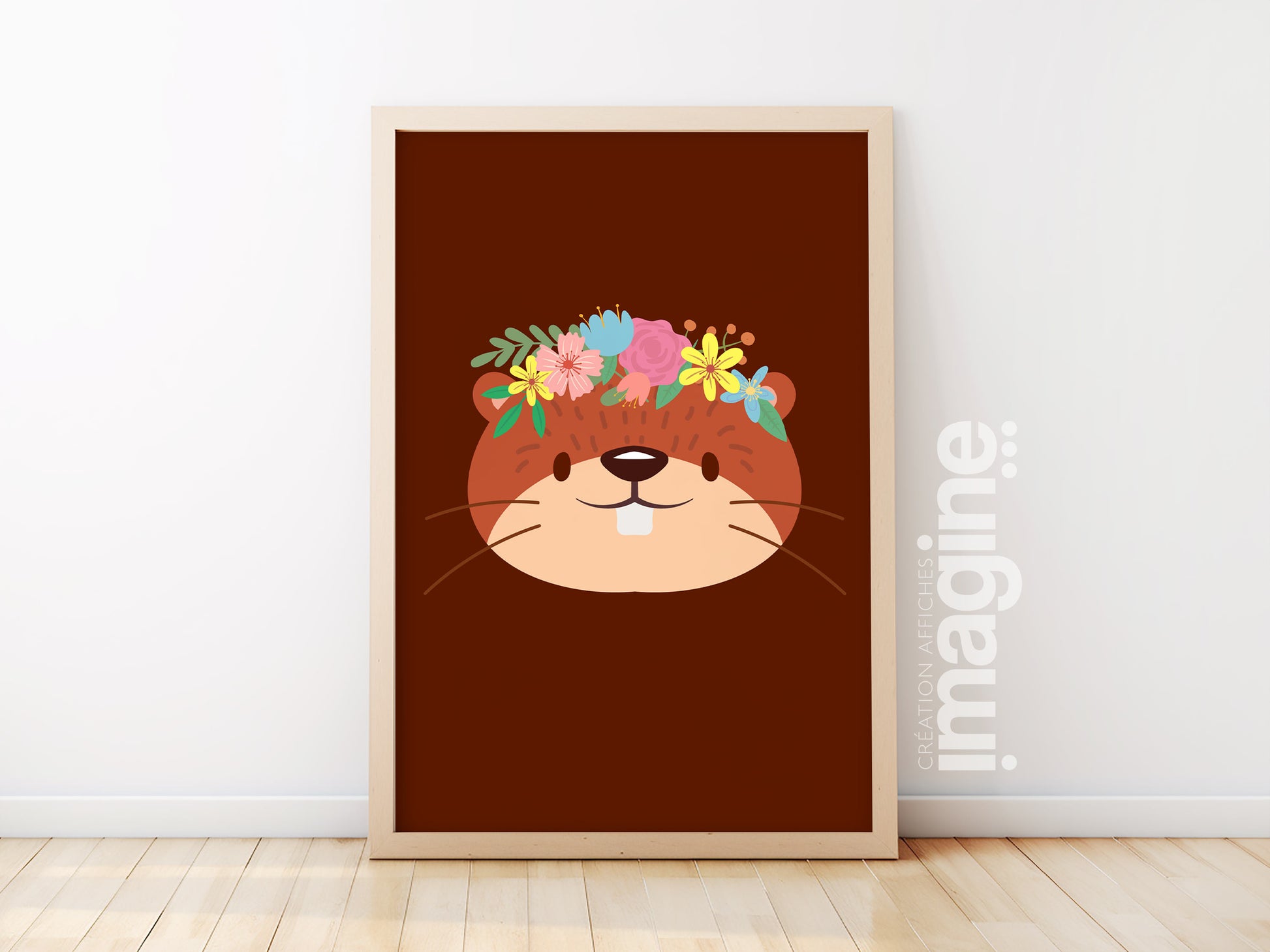 Affiche castor Animaux portrait romantique à couronne de fleurs