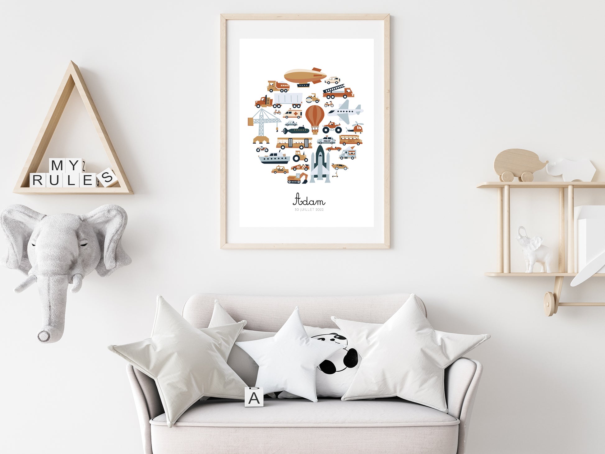 Cette affiche représente une illustration unique des véhicules et engins à moteur : montgolfière, moto, voiture, camion, vélo, trotinette, grue, sous-marin, bateau, fusée,... L'affiche est imprimée sur un papier d'une qualité supérieure de 200 grammes pour une présentation éclatante des couleurs et des détails.