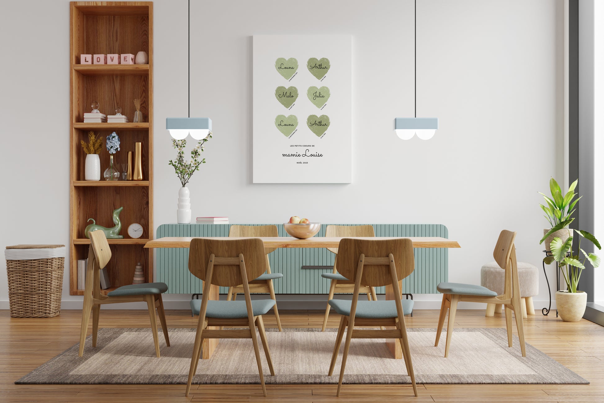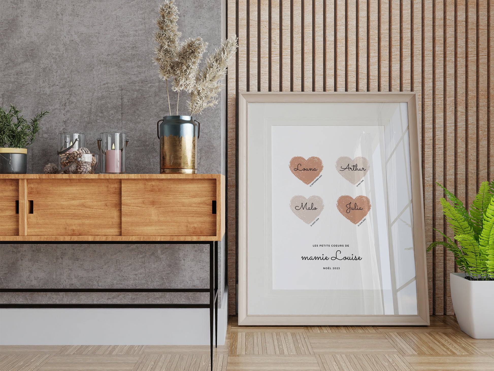 - Prénoms et Dates de Naissance : Chaque cœur sur l'affiche peut être personnalisé avec le prénom et la date de naissance d'un petit-enfant, faisant de ce tableau un hommage tendre et mémorable.