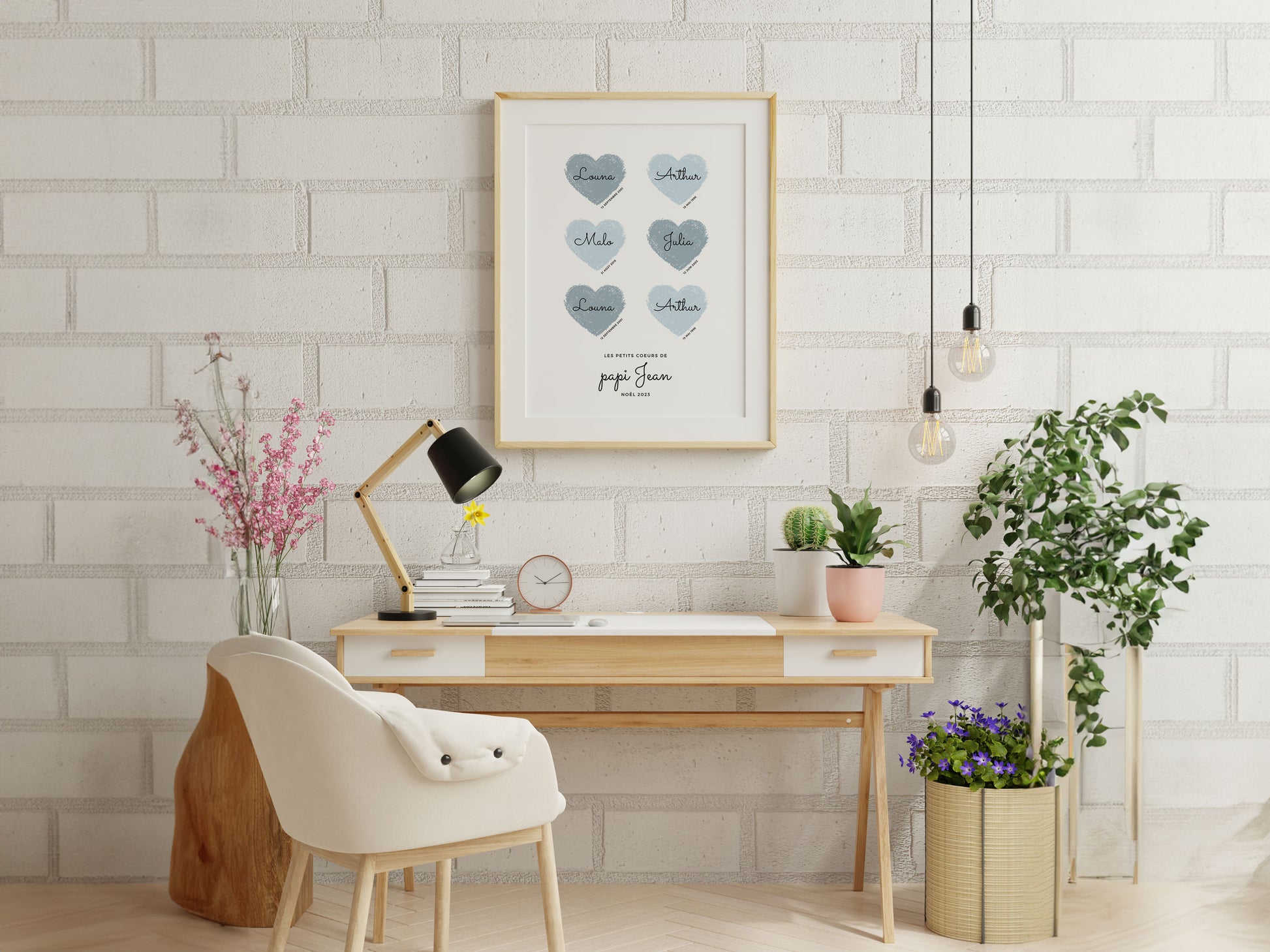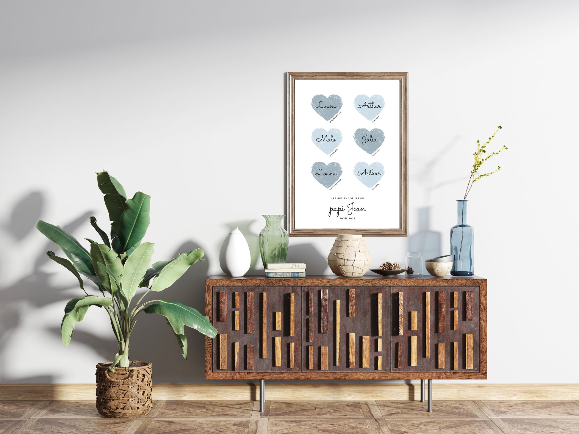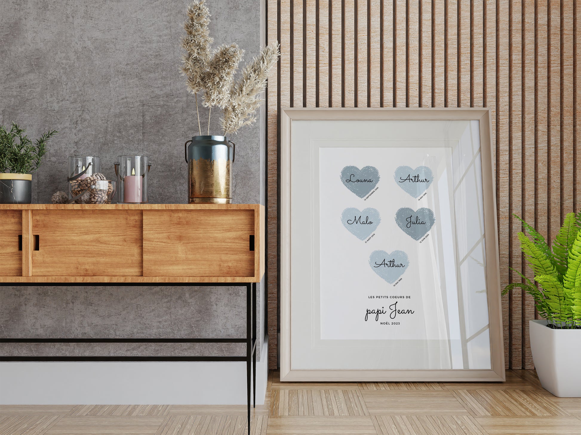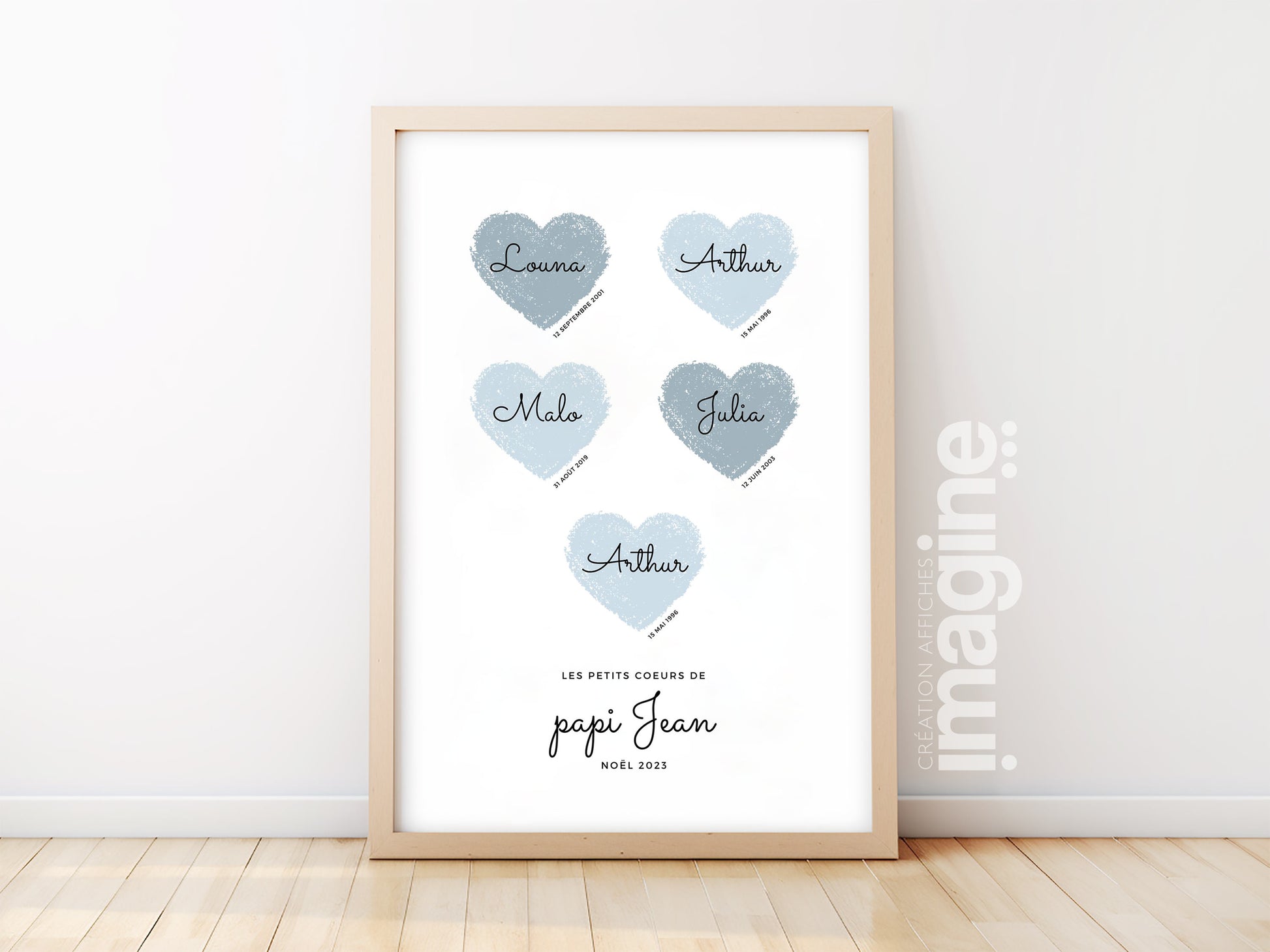- Prénoms et Dates de Naissance : Chaque cœur sur l'affiche peut être personnalisé avec le prénom et la date de naissance d'un petit-enfant, faisant de ce tableau un hommage tendre et mémorable.