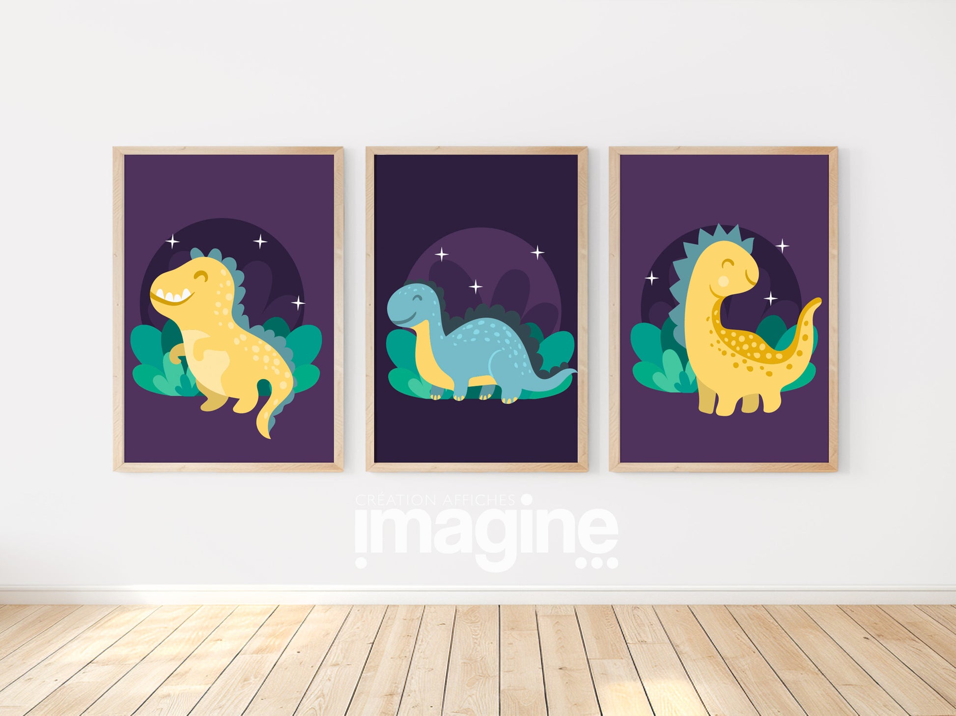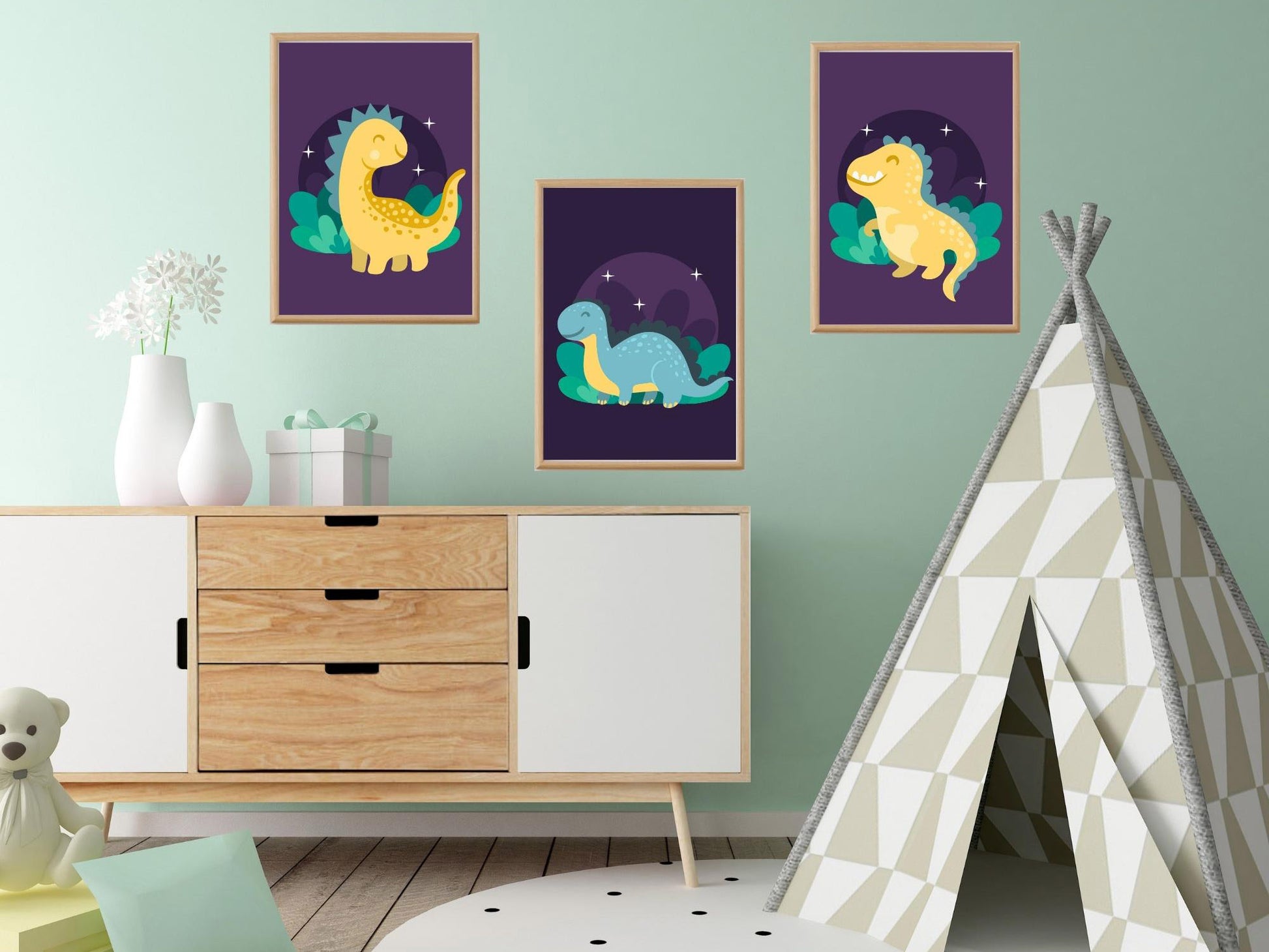 Set of 3 dinosaur posters for wall frame in children's or baby's room - Deco for boy and girl - A4 format - Prehistoric animals - Unframed.