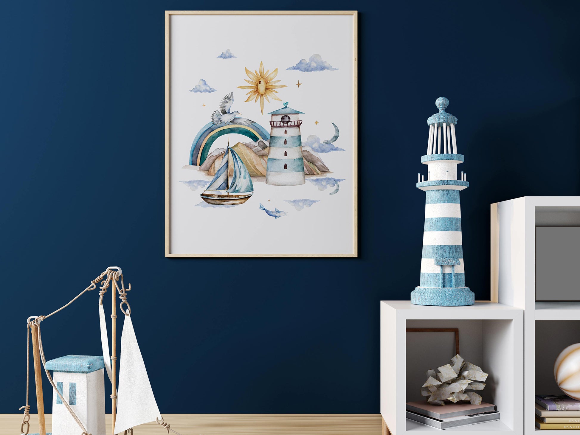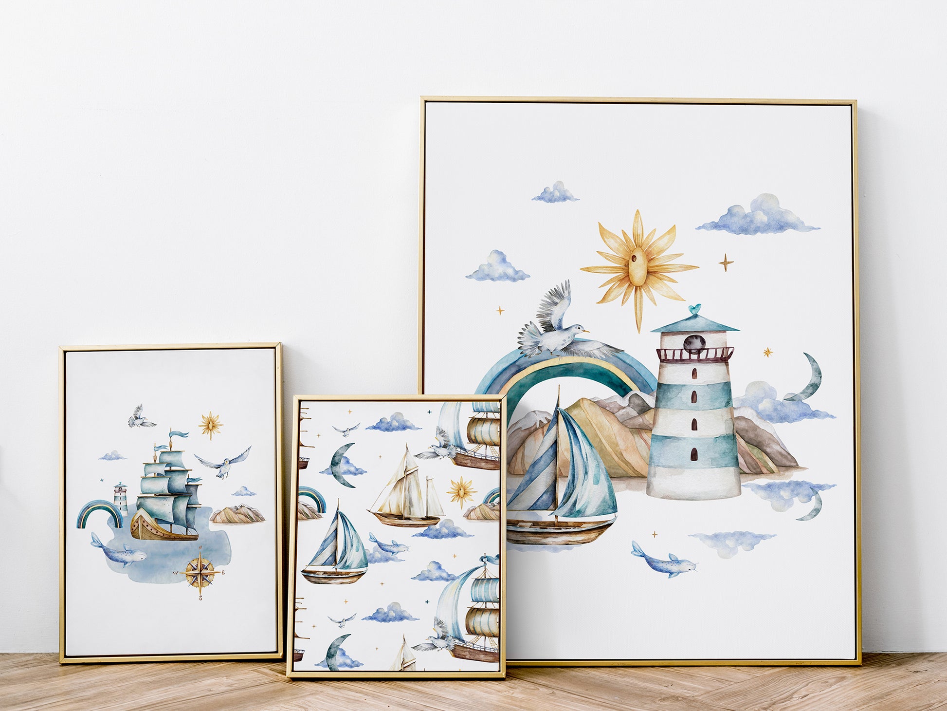 A creative pattern in a marine or sea style hand drawn (then reproduced). A watercolor style illustration for boys or girls on the ocean / marine theme: boat, whale, lighthouse and fish printed with soft powdery colors for pretty decorative posters with very soft patterns.