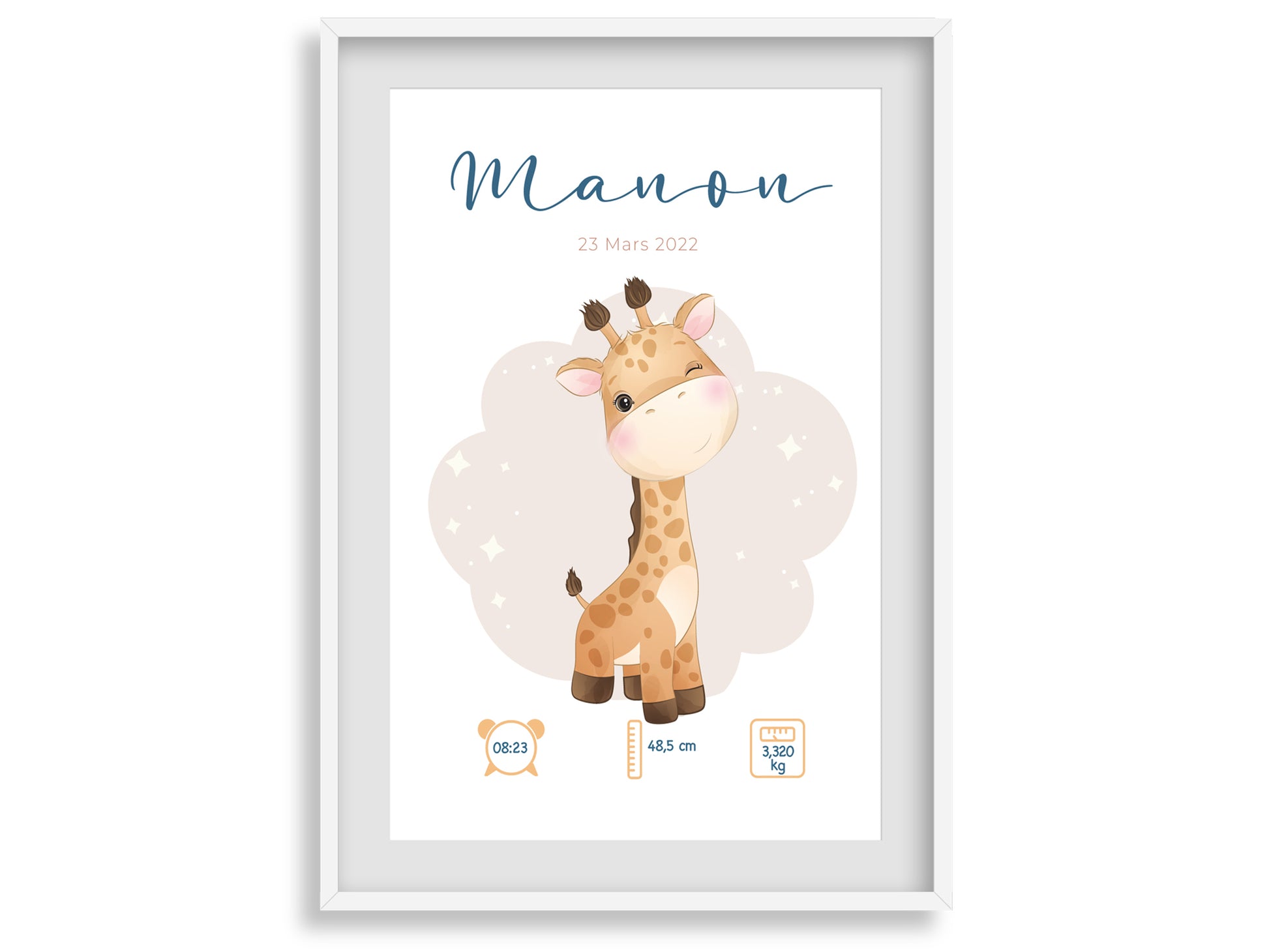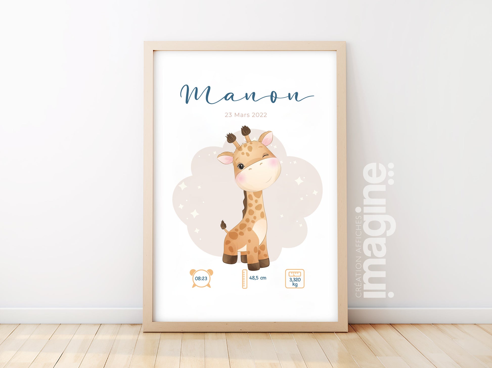 Affiche de naissance personnalisée "Girafe" - Affiche bébé souvenir - Prénom, poids, taille et heure