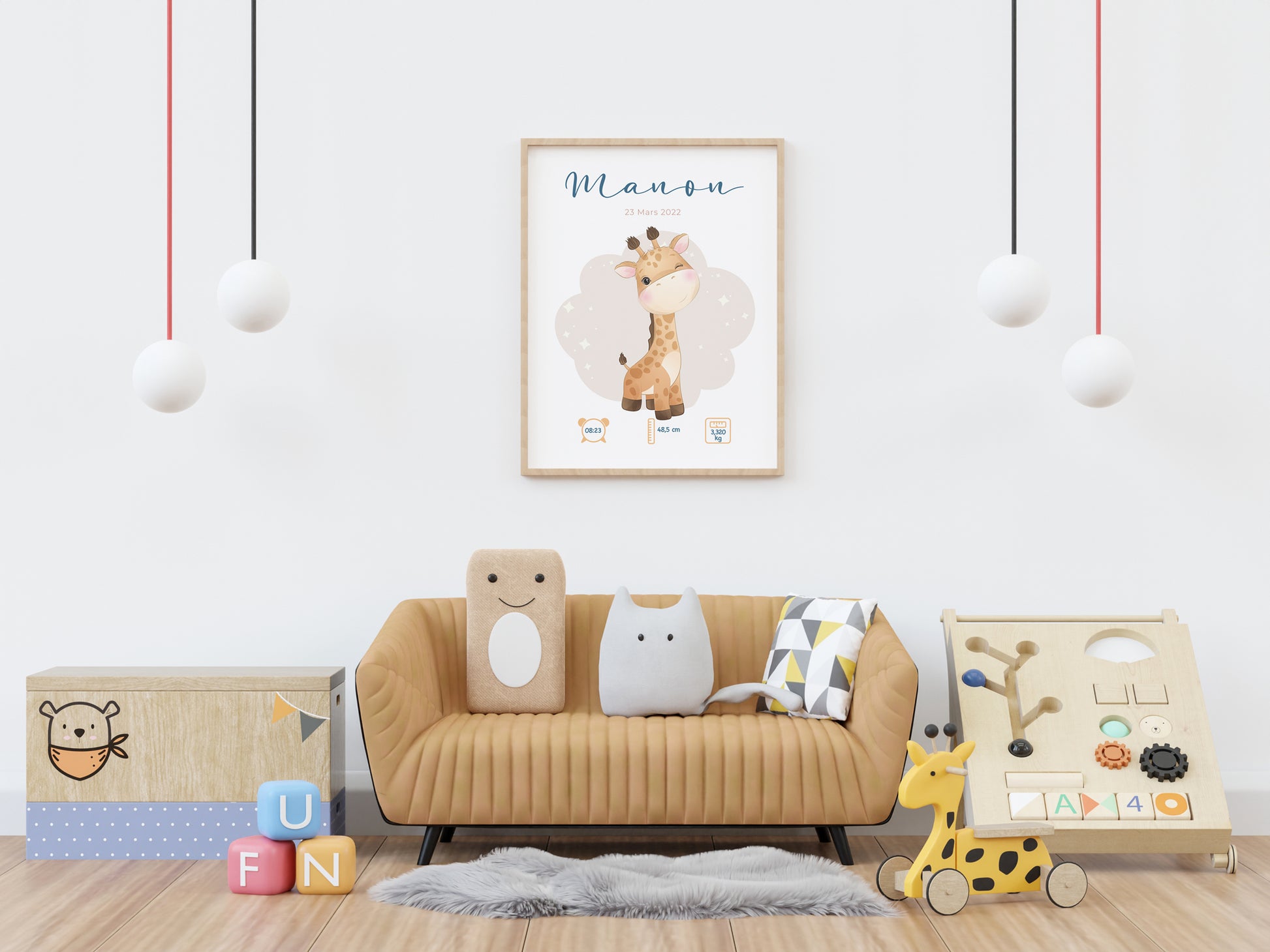 Commandez dès maintenant cette affiche de naissance "Girafe" personnalisée pour créer un environnement empli de douceur et de souvenirs précieux pour votre bébé. 🌈🌼🎁