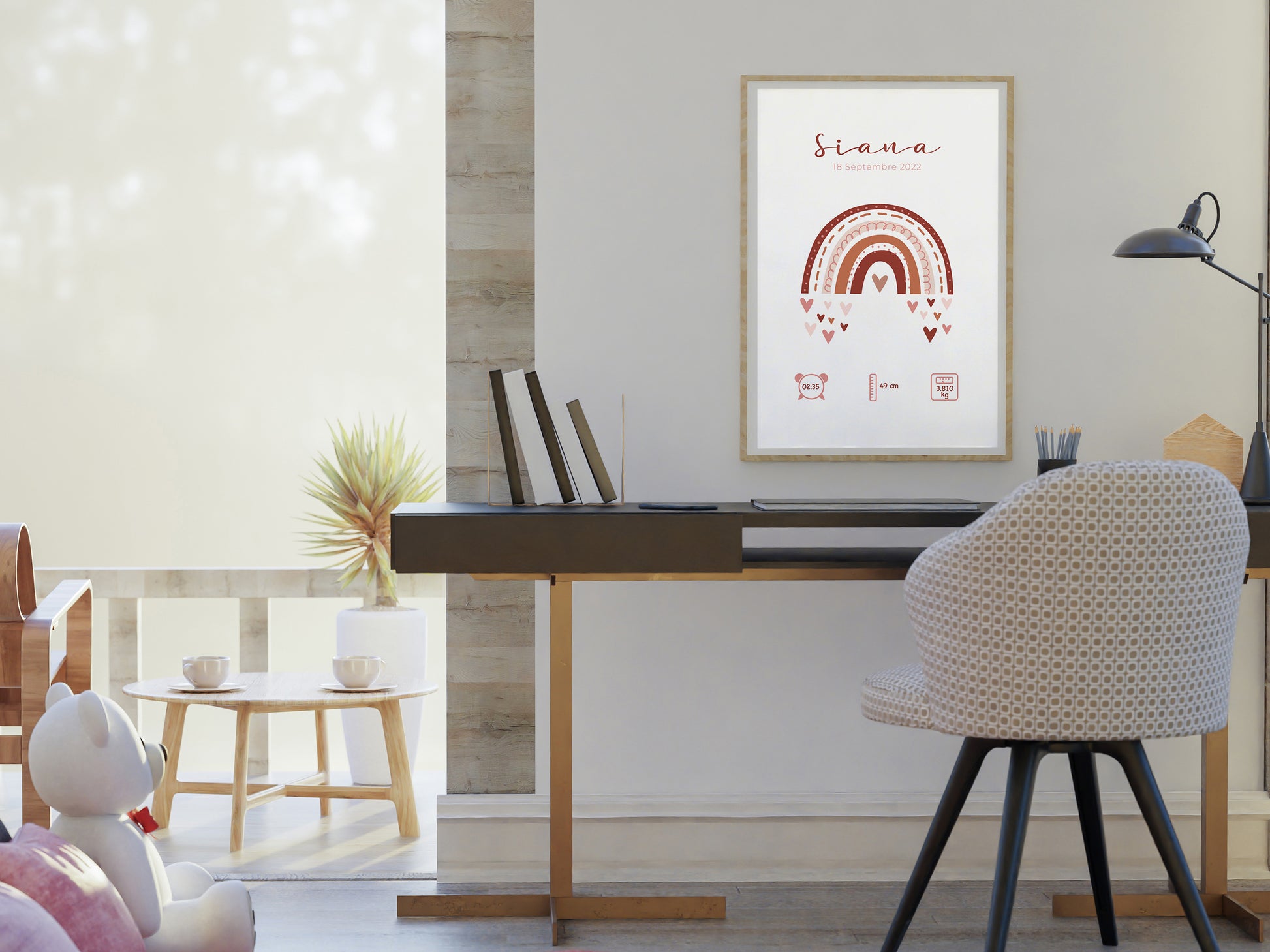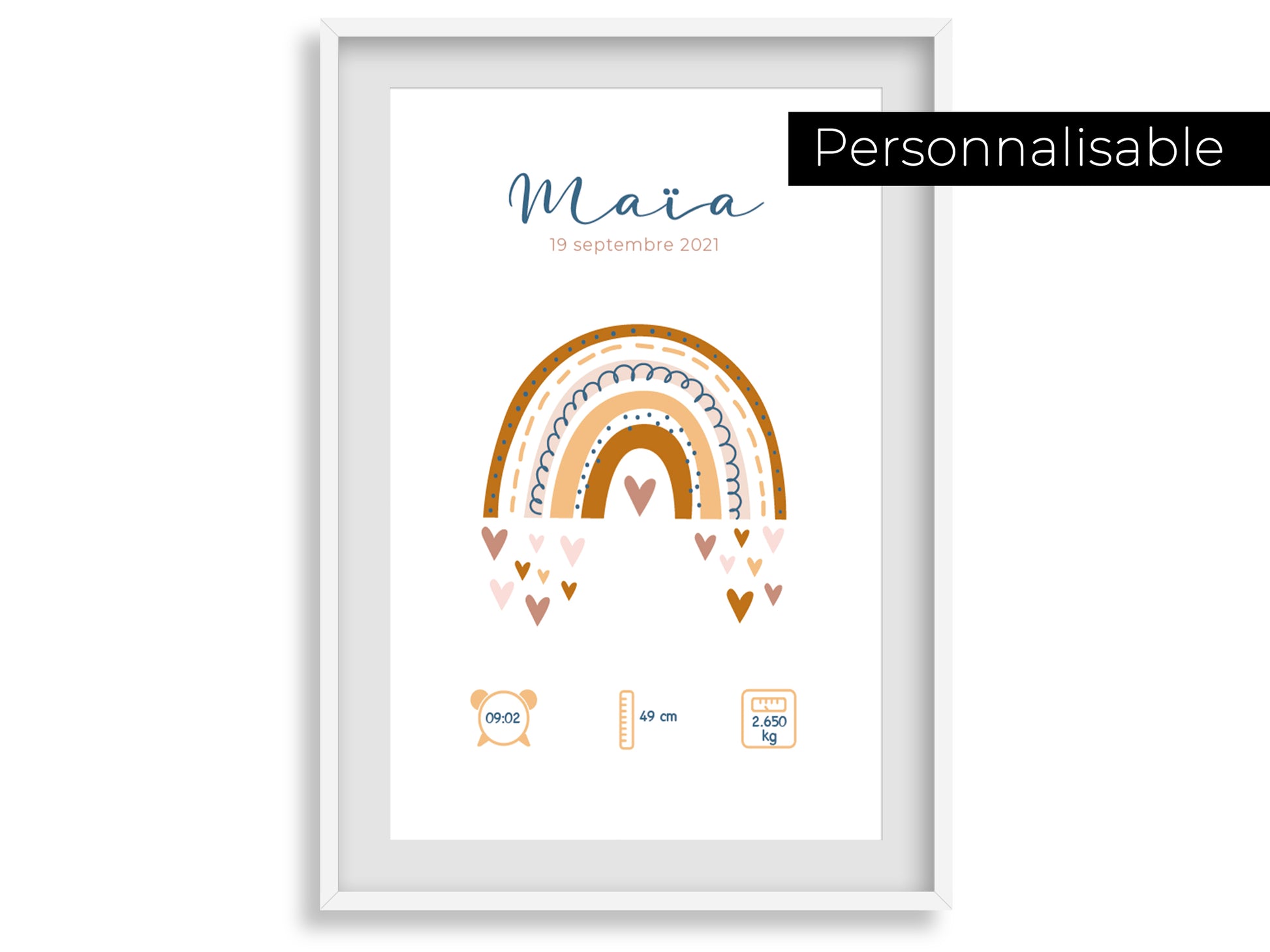 Offrez une affiche naissance personnalisée pour un cadeau unique qui plaira à coup sur. Ce joli arc en ciel fera craquer toutes les mamans.