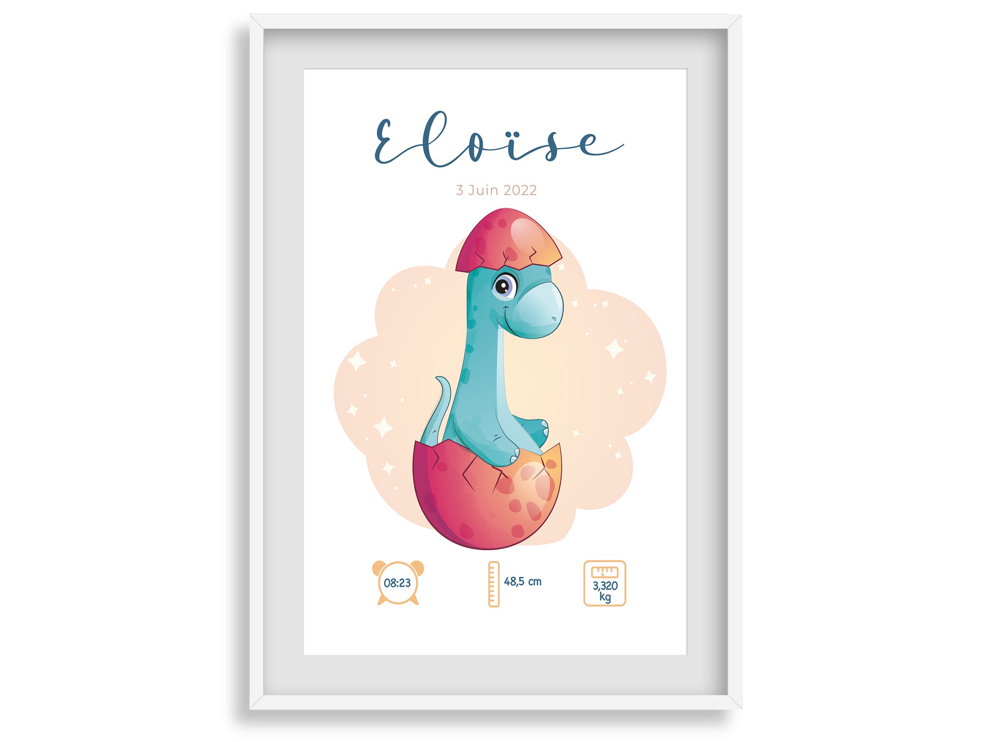 Ne manquez pas l'occasion de créer un souvenir unique et précieux pour votre bébé, ou d'offrir un cadeau de naissance qui sera apprécié et chéri pendant des années. Commandez dès maintenant notre affiche de dinosaure personnalisée et célébrez la naissance de votre bébé de la manière la plus originale qui soit !