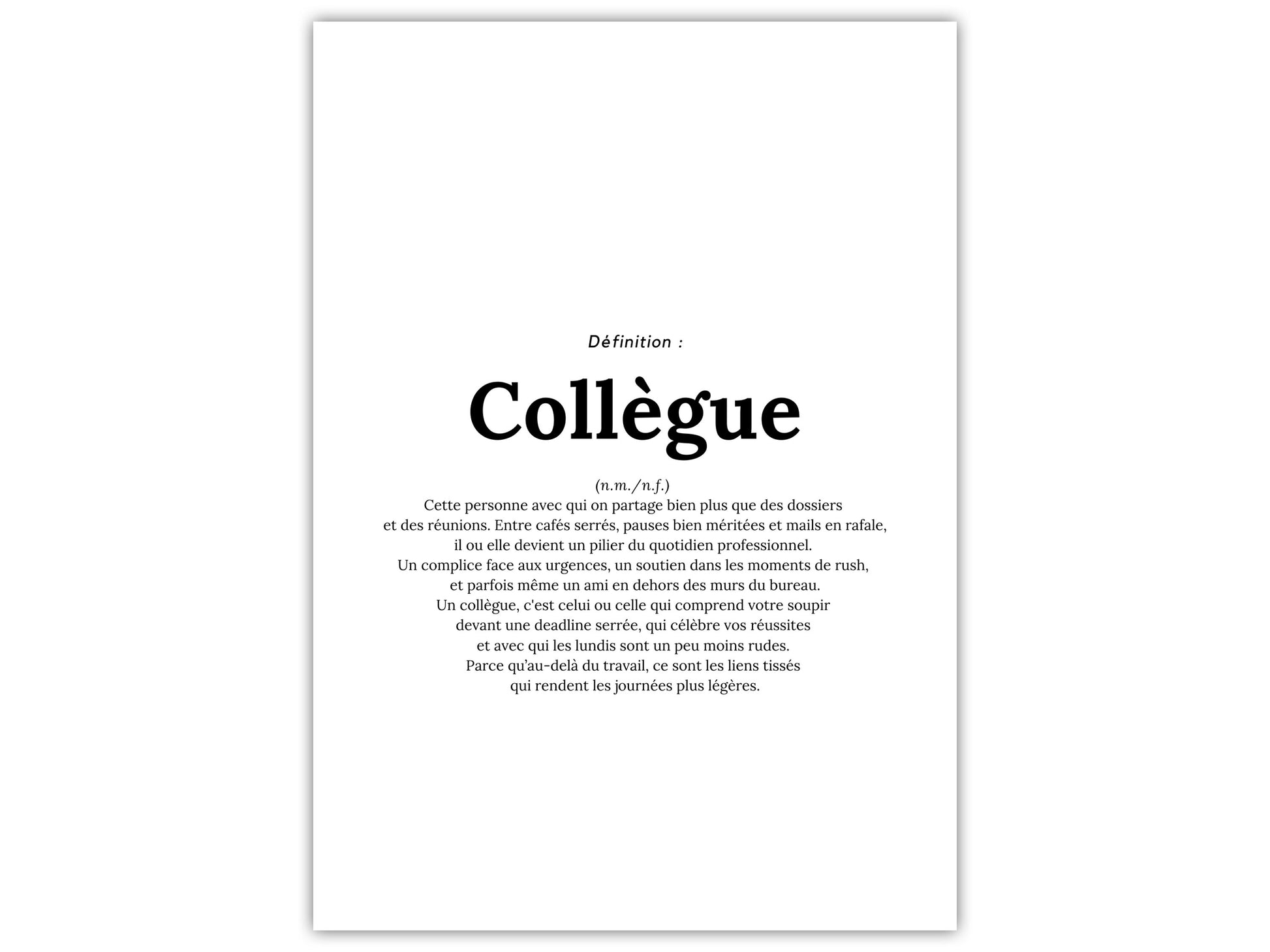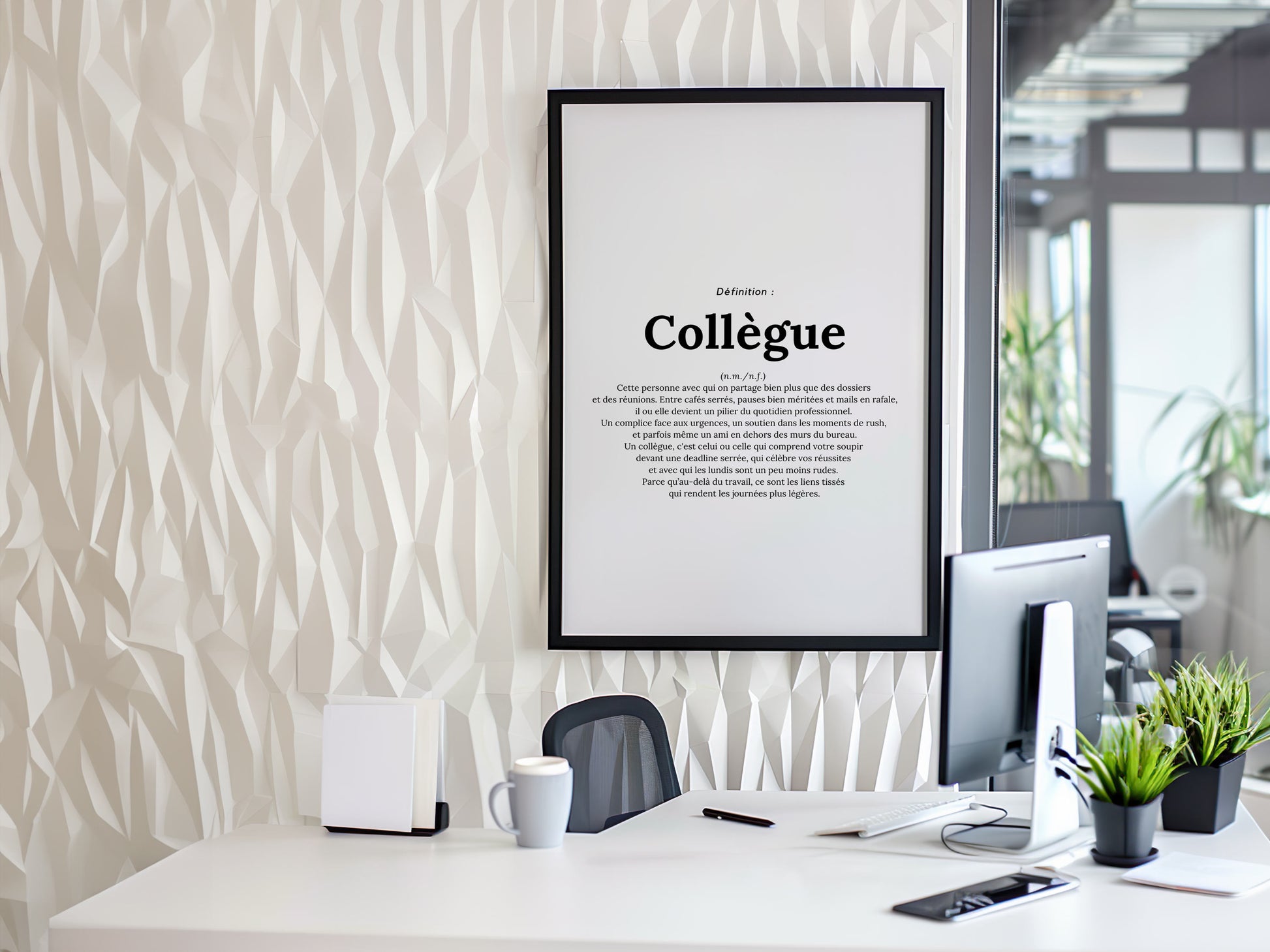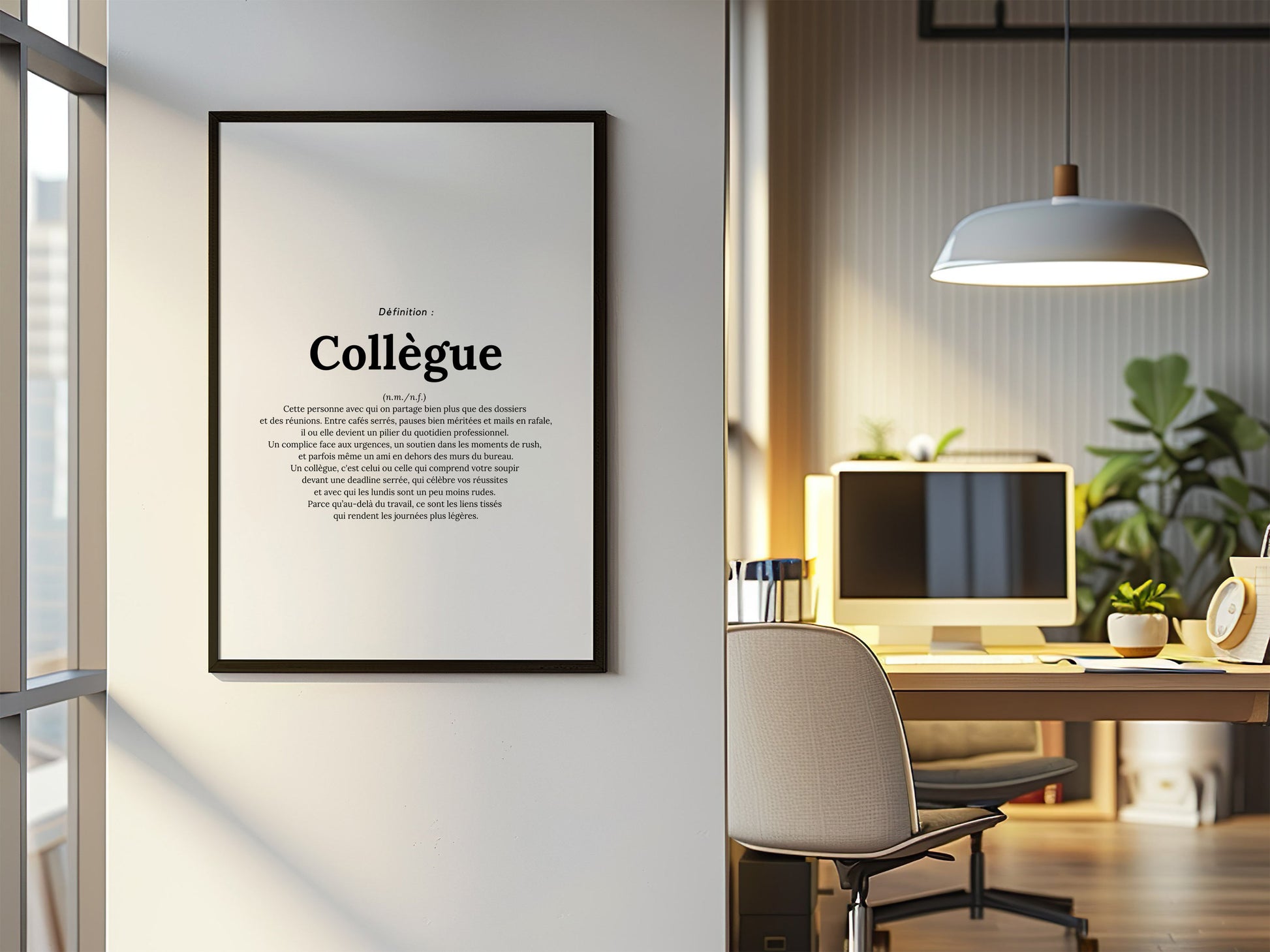 ✨ Affiche Définition "Collègue" – Parce qu’un bon collègue, c’est bien plus qu’un simple partenaire de bureau. Cette affiche met en mots avec humour, tendresse et justesse tout ce qui fait la richesse de cette relation unique : entre deadlines, cafés serrés et éclats de rire partagés.