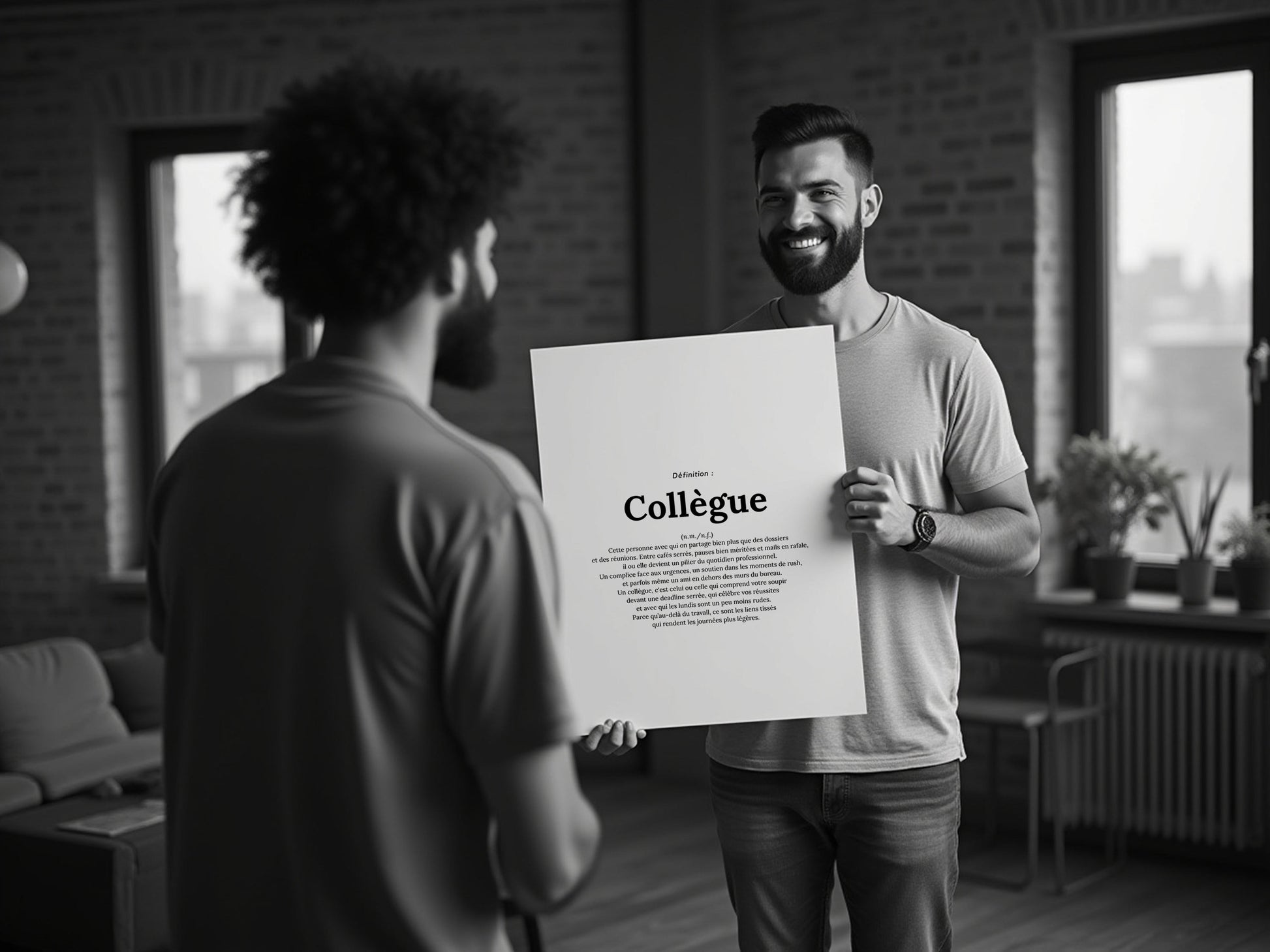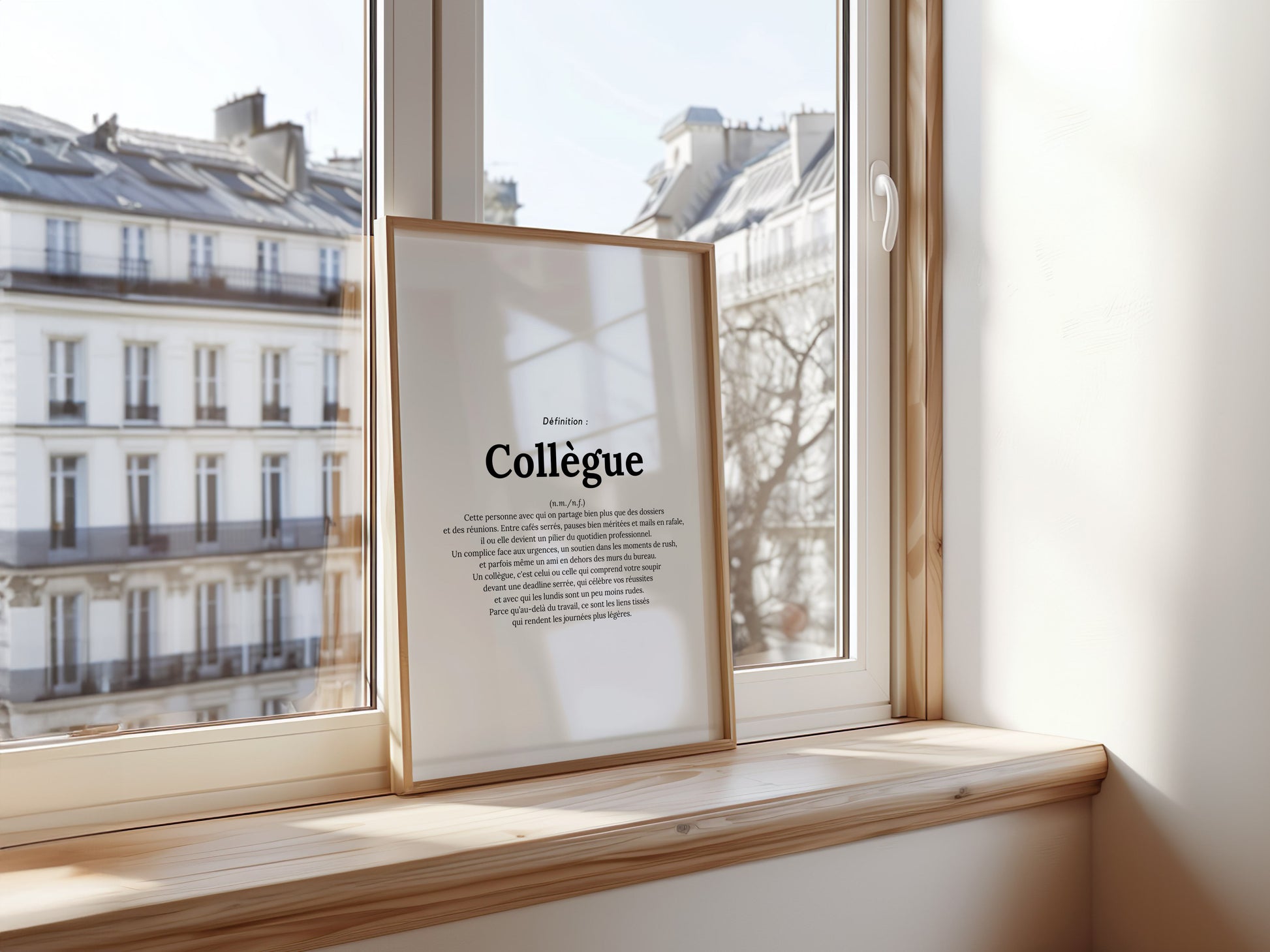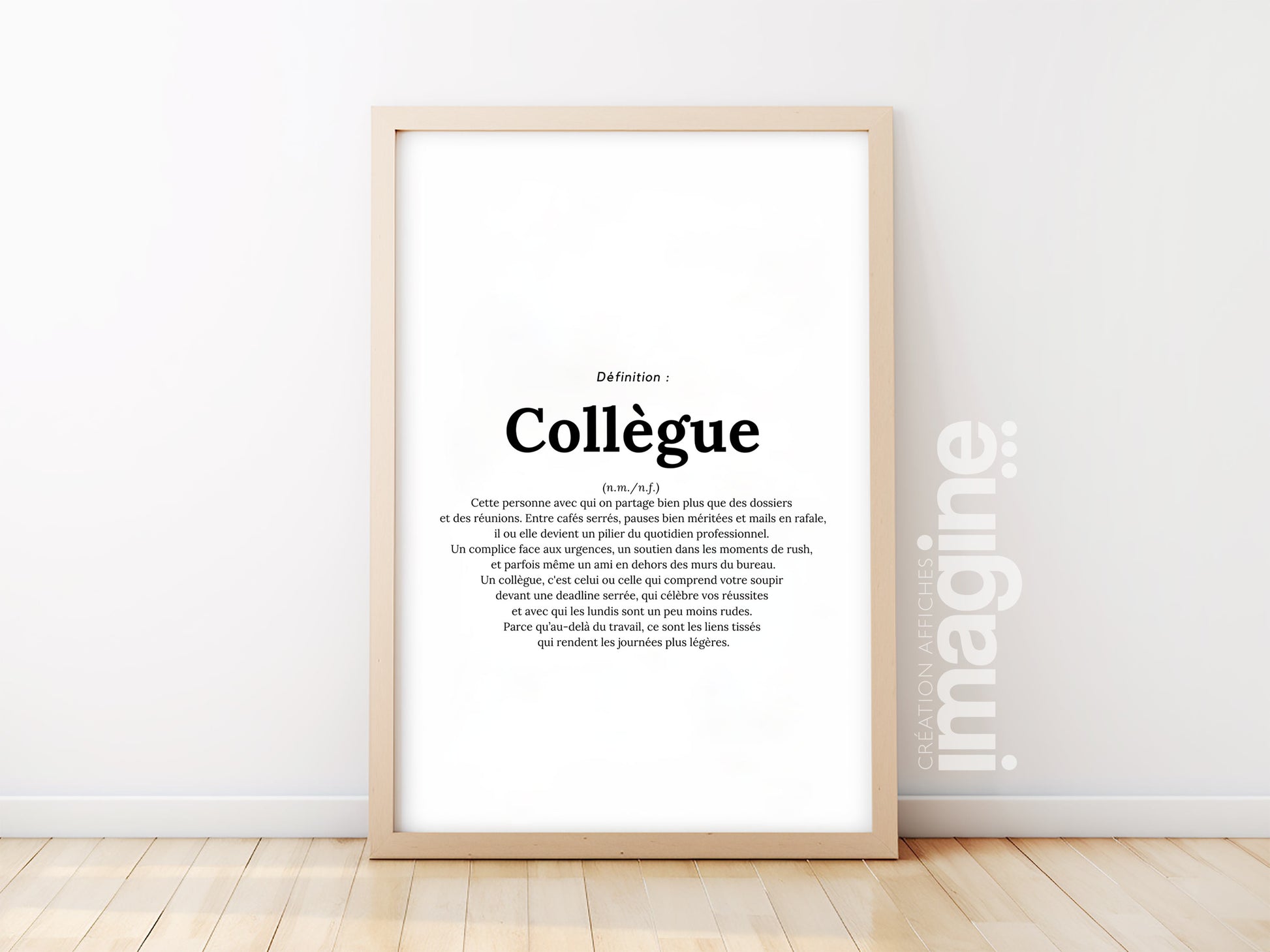 ✨ Affiche Définition "Collègue" – Parce qu’un bon collègue, c’est bien plus qu’un simple partenaire de bureau. Cette affiche met en mots avec humour, tendresse et justesse tout ce qui fait la richesse de cette relation unique : entre deadlines, cafés serrés et éclats de rire partagés.