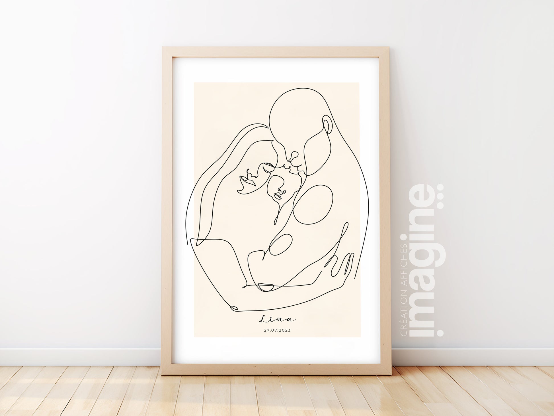 Découvrez une belle affiche en line art (trait noir) représentant une famille avec papa, maman et bebe, pour une décoration design et moderne de goût. Dans votre salon, votre salle à manger, votre chambre ou la chambre de votre bambin, cette affiche s'intègrera parfaitement à votre déco.