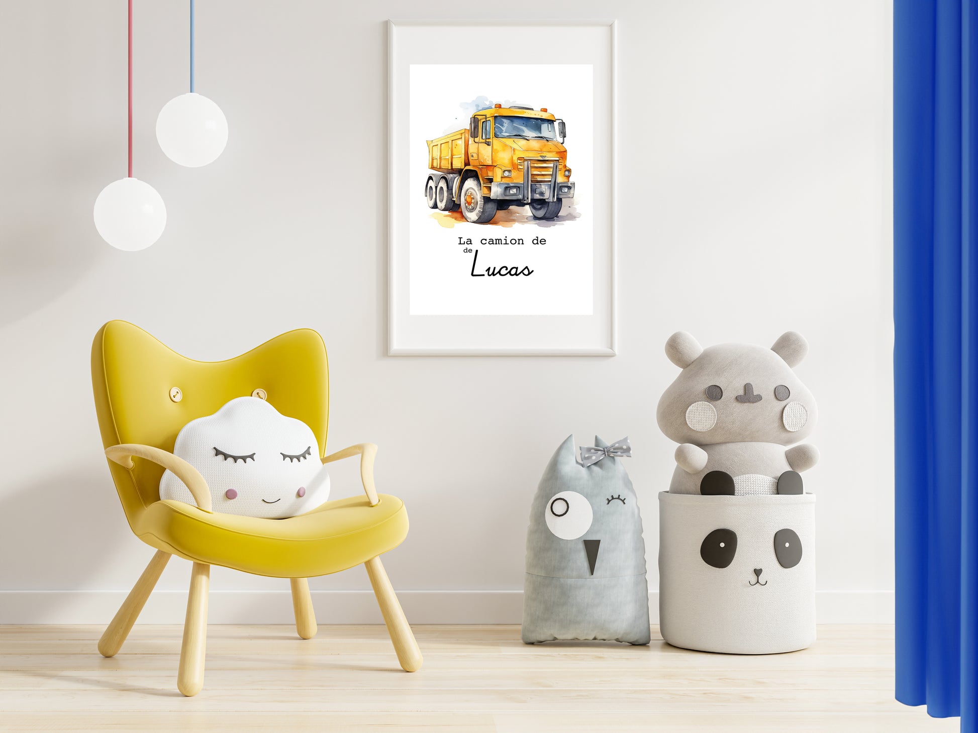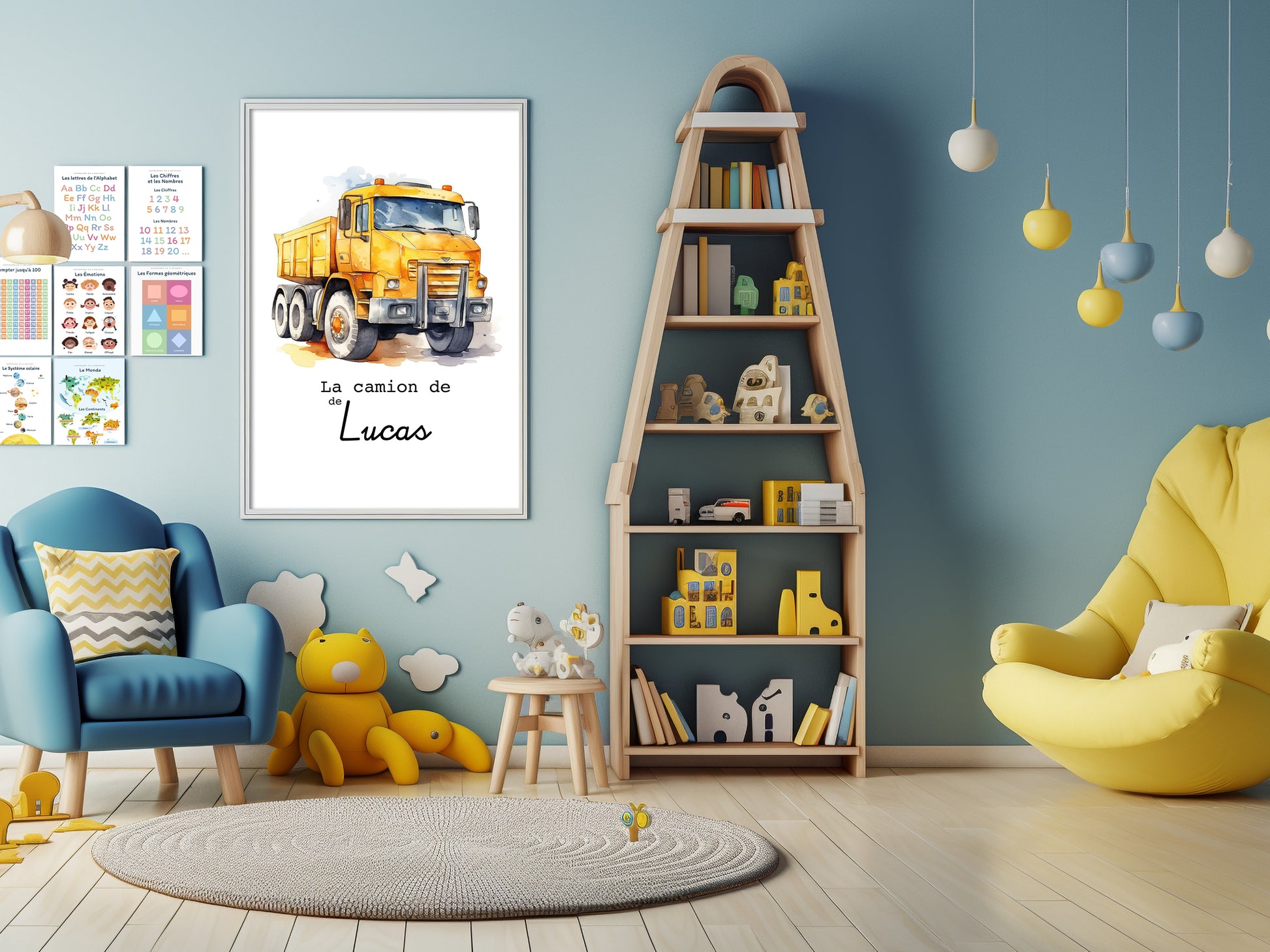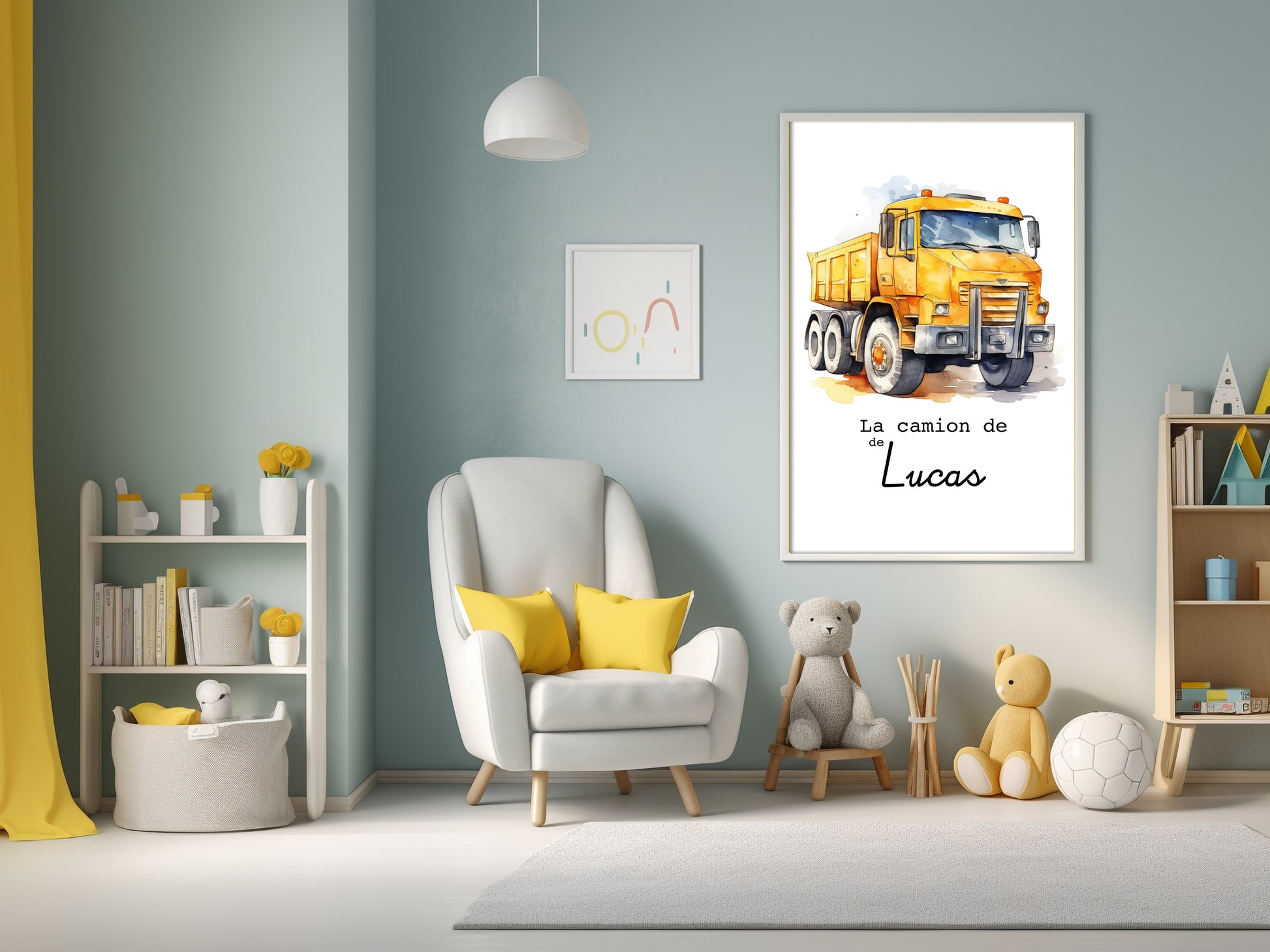 Affiche Personnalisée camion jaune de chantier - Le camion de {Prénom de l'Enfant} pour les petits fans de chantier et travaux