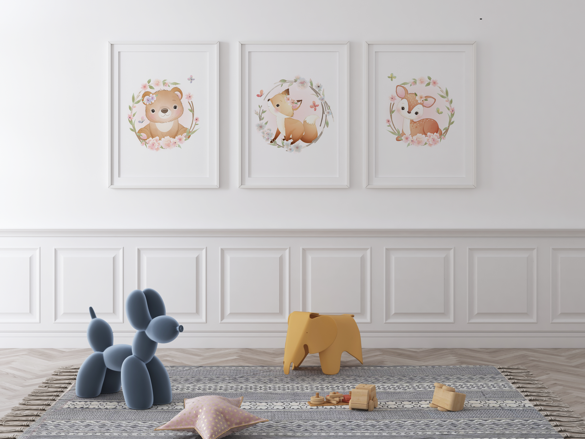 Le set de trois affiches pour enfant bébé sur le thème des animaux mignons est conçu pour aider les bébés à s'éveiller et à se calmer. Les affiches présentent des images de biche, de renard et d'ourson, qui sont tous des animaux adorables et qui évoquent la nature.